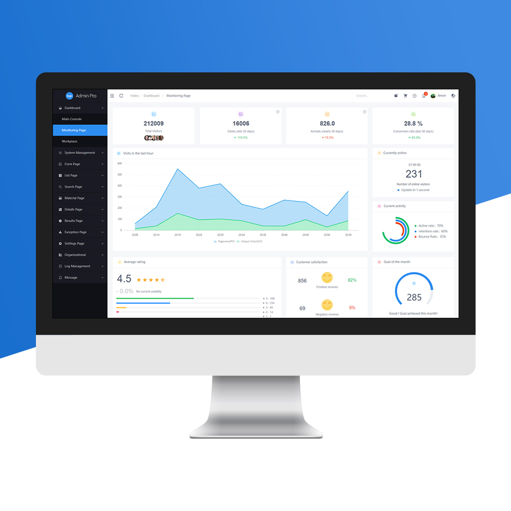 In terms of software technology, we used the master to design the left sidebar, so that you can quickly modify the menu of all pages. In addition, a large number of dynamic panels, repeaters, pop-up windows, etc., and dynamic charts are used to restore the interactive effect of the background to the highest degree.